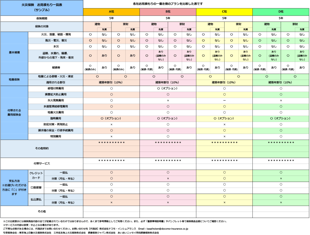 ドコモスマート保険ナビでも、火災保険の比較と見積もりを実施しております。ここよりご依頼をいただければ、補償内容と保険料が簡単に比較できる書類をお送りいたします。